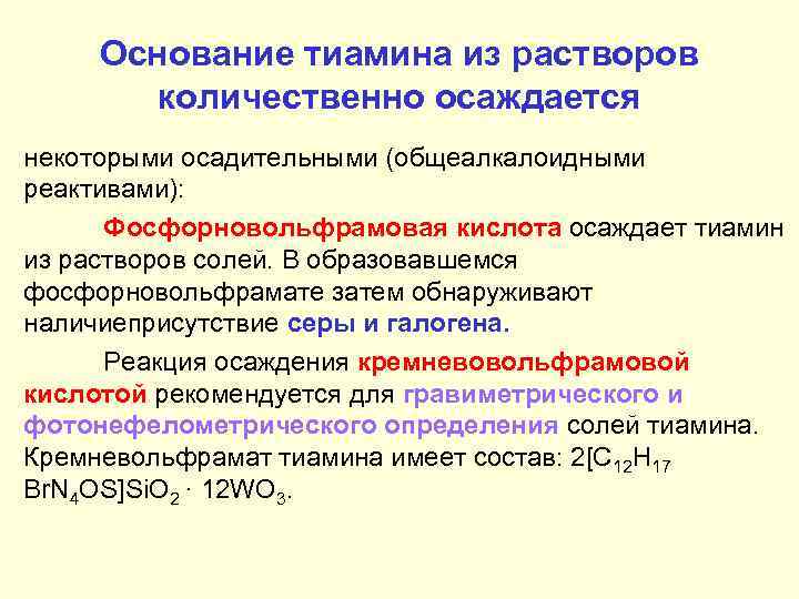 Тиами́н — органическое гетероциклическое соединение, водорастворимый витамин, отвечающий формуле C12H17N4OS . Бесцветное кристаллическое вещество, хорошо растворимое в воде, нерастворимое в спирте . Водные растворы тиамина в кислой среде выдерживают нагревание до . . .