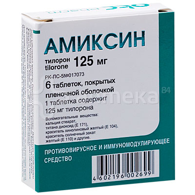 Условия хранения: В сухом, защищенном от света месте, при температуре 5-30 °C . Нормативный документ: ЛП 001394-281211 . Состав: Тилорон 60/125 мг . Фармакологическое действие: Противовирусное, иммуностимулирующее . Связанные штрихкоды . 4670033320640 . 4670033320633 . 4690655019234 . 4690655019241 .