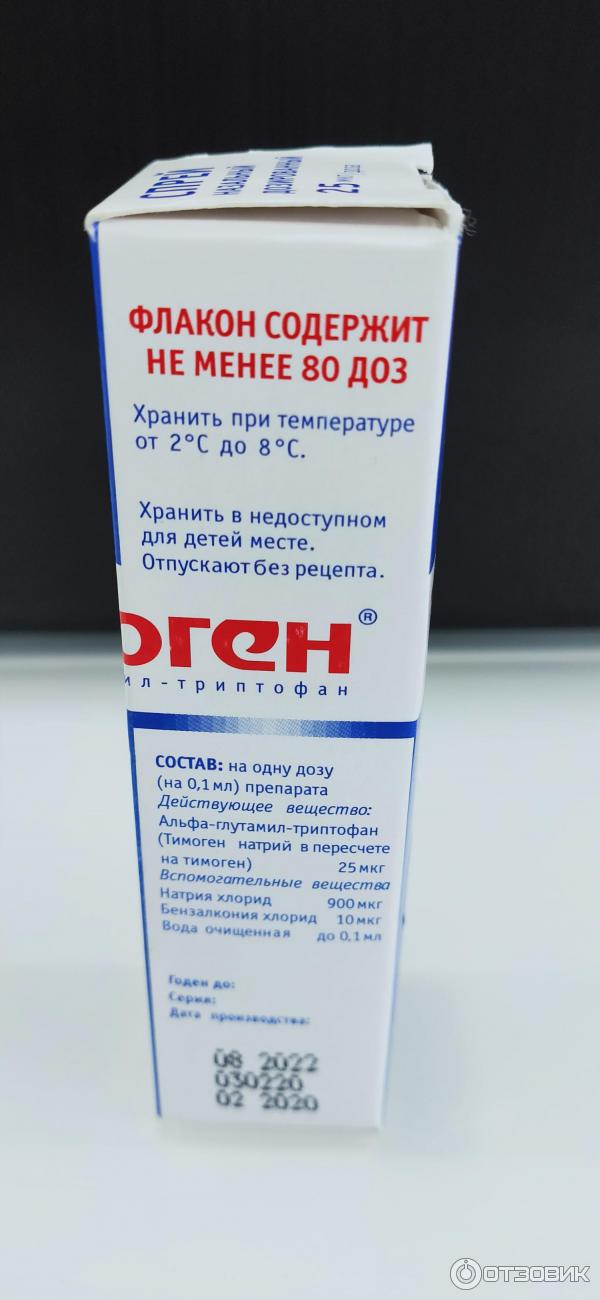 Описание препарата Тимоген® (спрей назальный дозированный, 25 мкг/доза) основано на официальной инструкции, утверждено компанией-производителем в 2021 году Дата согласования: 01 .02 .2021 Содержание Действующее вещество Аналоги по ATX Фотографии упаковок Фармакологическая группа Нозологическая классификация (МКБ-10) Состав