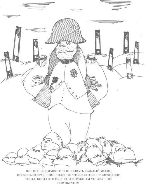 Так же и с теми решениями, которые принимаются. Никогда количество решений не заменит их точности. Не может быть много правильных решений – их всегда очень мало. Крайне важно, чтобы ресурс компании, любой – управленческий, материальный, не растрачивался впустую. У того же Наполеона, великого управленца и новатора своего времени, не было на самом деле необходимости выигрывать каждый месяц несколько сражений. Происходили битвы время от времени – главное, что они происходили тогда, когда ему это было нужно, и с нужным ему результатом. Как только Наполеон поплыл в формулировке целей – начались проблемы. Если цели сформулированы и они прошли проверку критикой, ты в них поверил – возникает вторая очень важная позиция для управленца – это люди. Есть у нас расхожее выражение «команда», его интерпретаций еще больше, но, если это свести к школярским вещам, команда – это ресурс, который обеспечивает наличие самой важной характеристики компании – управляемости.