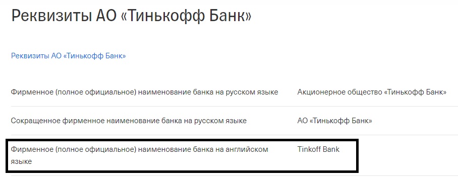 Тинькофф официальные реквизиты