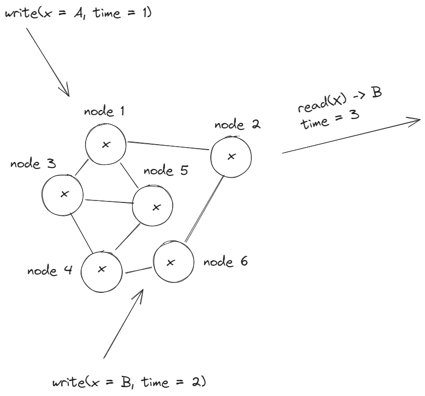 Распределенные системы состоят из множества нод (серверов), которые взаимодействуют друг с другом. Данные распределены между этими нодами при помощи партиционирования/шардирования, т.к. они могут не помещаться на один сервер или для более быстрого доступа они могут быть размещены в разных географических зонах. Кроме того данные дублируются и реплики (копии) данных размещаются на разных нодах репликах. Это необходимо на случай отказа сервера для предотвращения потери данных, а также если нагрузка на систему большая, чтобы все клиенты не читали одни и те же данные с одного сервера, а делали это с разных нод реплик для распределения нагрузки. Т.к. чтение данных может производиться из любой из нод реплик, нам нужно понять, какие гарантии мы можем предоставить клиентам о том, какое значение они прочитают. Будет ли это последнее из записанных значений, устаревшее значение или какое либо еще. Эти гарантии описываются при помощи модели Consistency, которую поддерживает наша распределенная система.