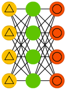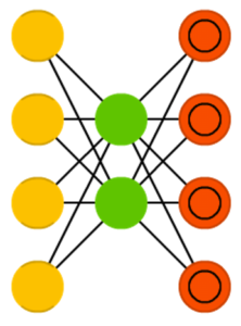 Автокодировщик (autoencoder, AE) чем-то похож на FFNN, так как это скорее другой способ использования FFNN, нежели фундаментально другая архитектура. Основной идеей является автоматическое кодирование (в смысле сжатия, не шифрования) информации. Сама сеть по форме напоминает песочные часы, в ней скрытые слои меньше входного и выходного, причём она симметрична. Сеть можно обучить методом обратного распространения ошибки, подавая входные данные и задавая ошибку равной разнице между входом и выходом.