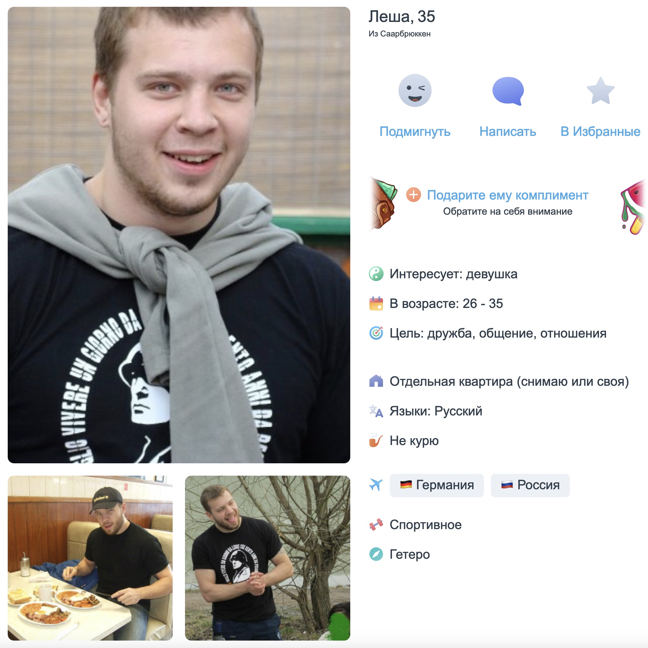 Алексей, 35 лет, ищет девушку 26-35 лет для дружбы и отношений. Указан город Саарбрюккен (справка: город на западе Германии, административный центр земли Саар и одноимённого района. Расположен непосредственно на границе с Францией. Население составляет 175,5 тыс. человек.)