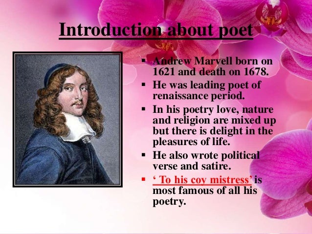 Перевести · 29.09.2017 · Andrew Marvell And A Summary of To His Coy Mistress The poem is a tour de force, and has come to be known as a seduction poem or carpe diem (seize or pluck the day) poem. Wit, allusion and metaphor are all employed in what is a syllogism - a …