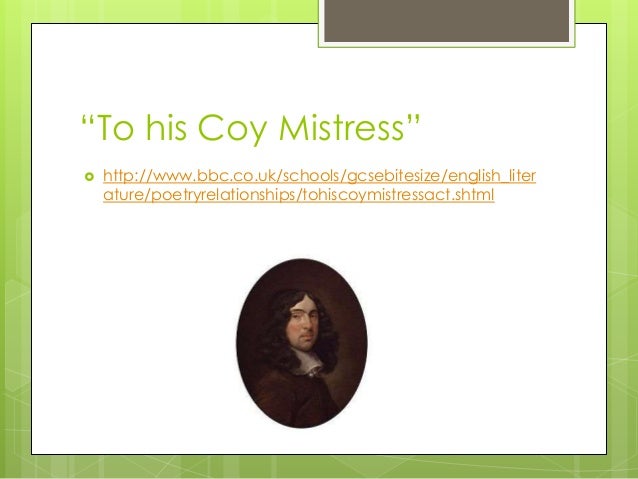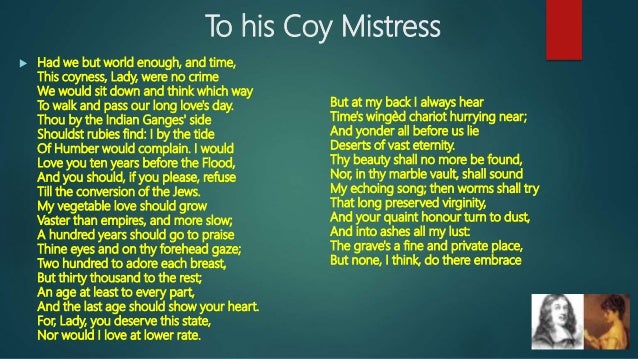 Перевести · 28.07.2016 · ‘To His Coy Mistress’ by Andrew Marvell details the efforts of a man towards insisting on his lover’s affection. The unnamed “Coy Mistress” refuses to sleep with the gentleman in question, and his …
