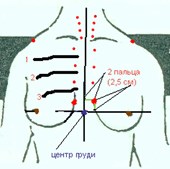 Точки для массажа расположены на ладонях, на стопах, на груди с двух сторон от грудины и на кисти в месте соединения большого и указательного пальцев .