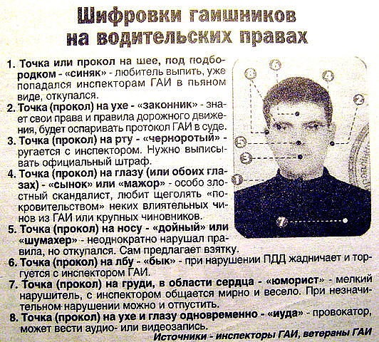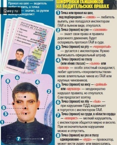 Точка, поставленная у рта, предупреждает, что владелец прав легко переходит на агрессию, ожесточённо спорит и ругается . Точки на водительском удостоверении сулят много неурядиц их владельцу . Водитель будет постоянно испытывать на себе предвзятое отношение со . . .