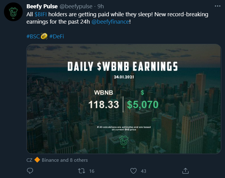 Комиссии с пользователей сервисом берутся не в нативных токенах проекта, а в токенах сети Binance (BNB), что придает токенам Beefy Finance бОльшую ценность и надежность по сравнению с вариантами дохода в своих собственных токенах. Про токены BNB упоминалось в одной их прошлых статей, а более подробную информацию о них можно узнать на официальном сайте Binance.