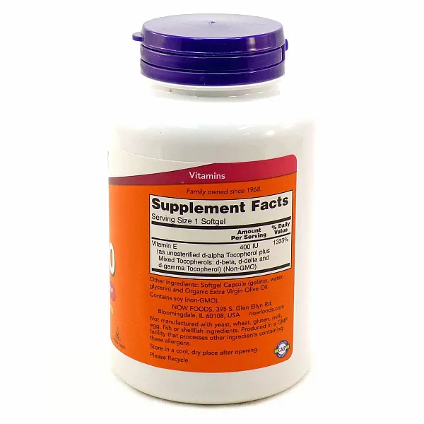 Витамин Е (альфа-токоферол, бета-, дельта- и гамма-токоферолы) 400 МЕ 1333 Другие ингредиенты: Соевое масло, желатин, глицерин, очищенная вода . Не содержит сахара, дрожжей, пшеницы, глютена, ячменя, рыбы, моллюсков, арахиса, яиц или молока . Нет искусственных красителей, ароматизаторов или консервантов . Содержит сою . Предупреждения