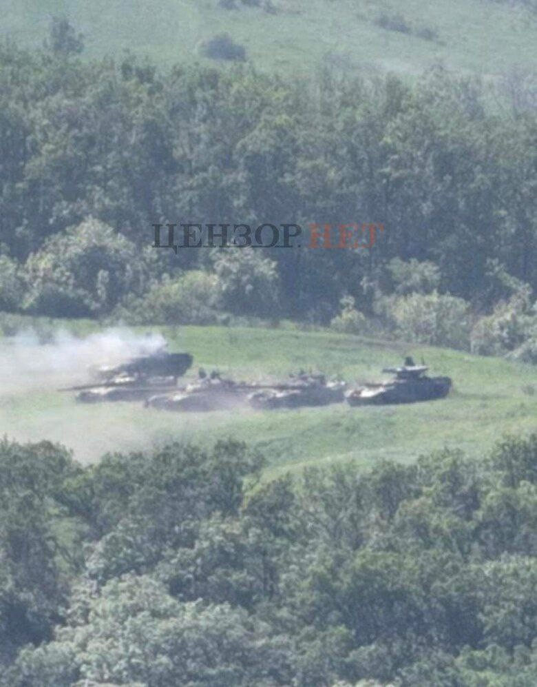 Виступ біля Попасної… Кажуть, «кіт за двері — миші у танок», це добре видно на двох фото, знятих десь уздовж траси Т1302 між Попасною та Сєвєродонецьком, 24–27 травня: доки поруч не було української артилерії, росіяни розташували танки та БМП 90-ї танкової дивізії на довколишніх схилах і обстрілювали захисників, як заманеться… Та щойно українська артилерія відповіла вогнем, росіяни швидко відступили.