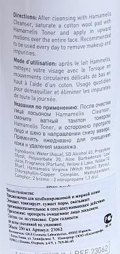 Основной компонент гамамелис или орех Вирджинии . Целебный экстракт получают из листьев и коры этого кустарника . Лосьон обладает антисептическим действием (эффективен при лечении гнойных воспалений), сосудосуживающим (поэтому оказывает благоприятное воздействие при куперозе), тонизирующим, освежающим действиями .