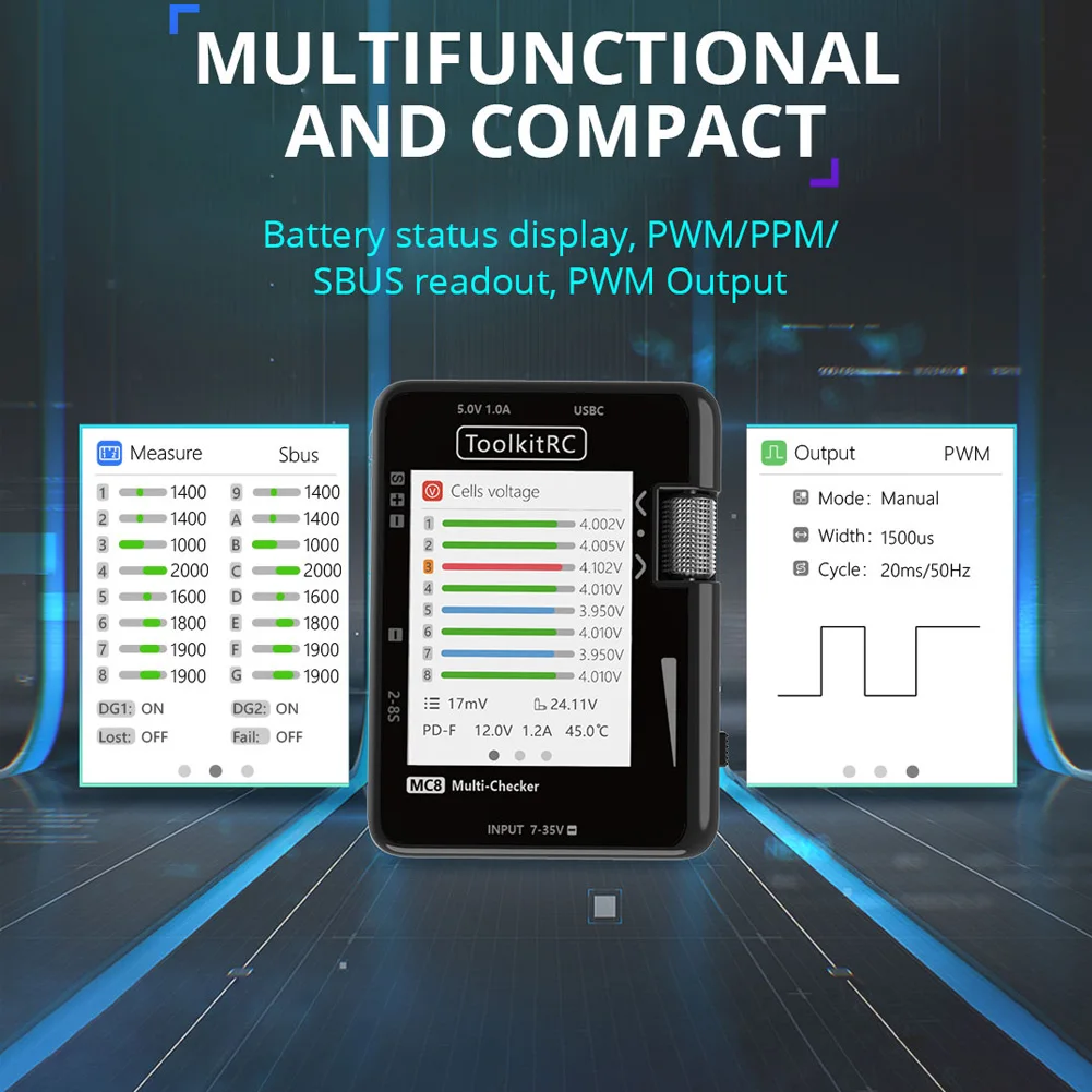 KXEPQwUbbAHere you can buy ToolkitRC MC8 Mini Size Cell checker 32 Bit Battery Multi-Checker PWM Output PPM SBUS Readout With USB-C Fast Charging with free delivery to your post office.