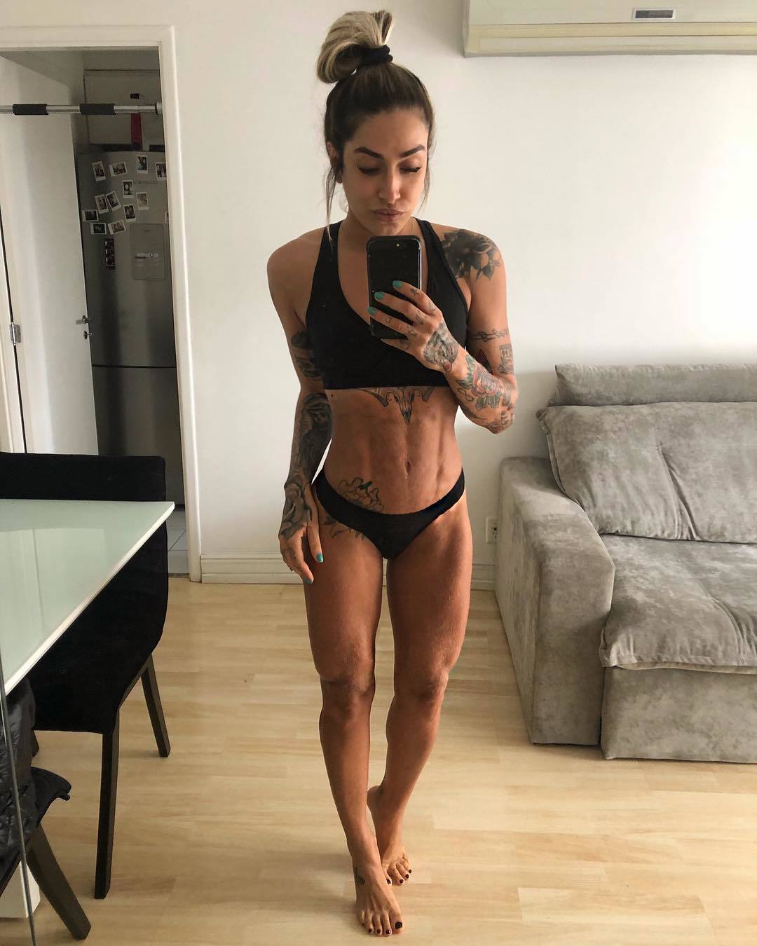 Chubby female wrapping her body in tight latex shorts