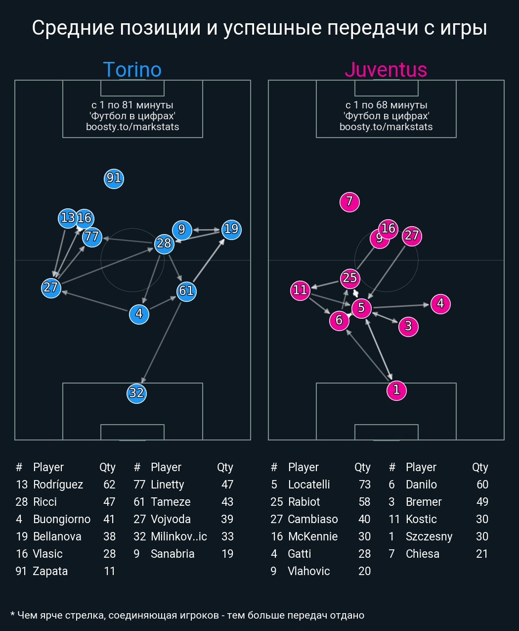 49 успешных передач из 64 попыток (2 под удар, 5 с продвижением, 14 на трети соперника)