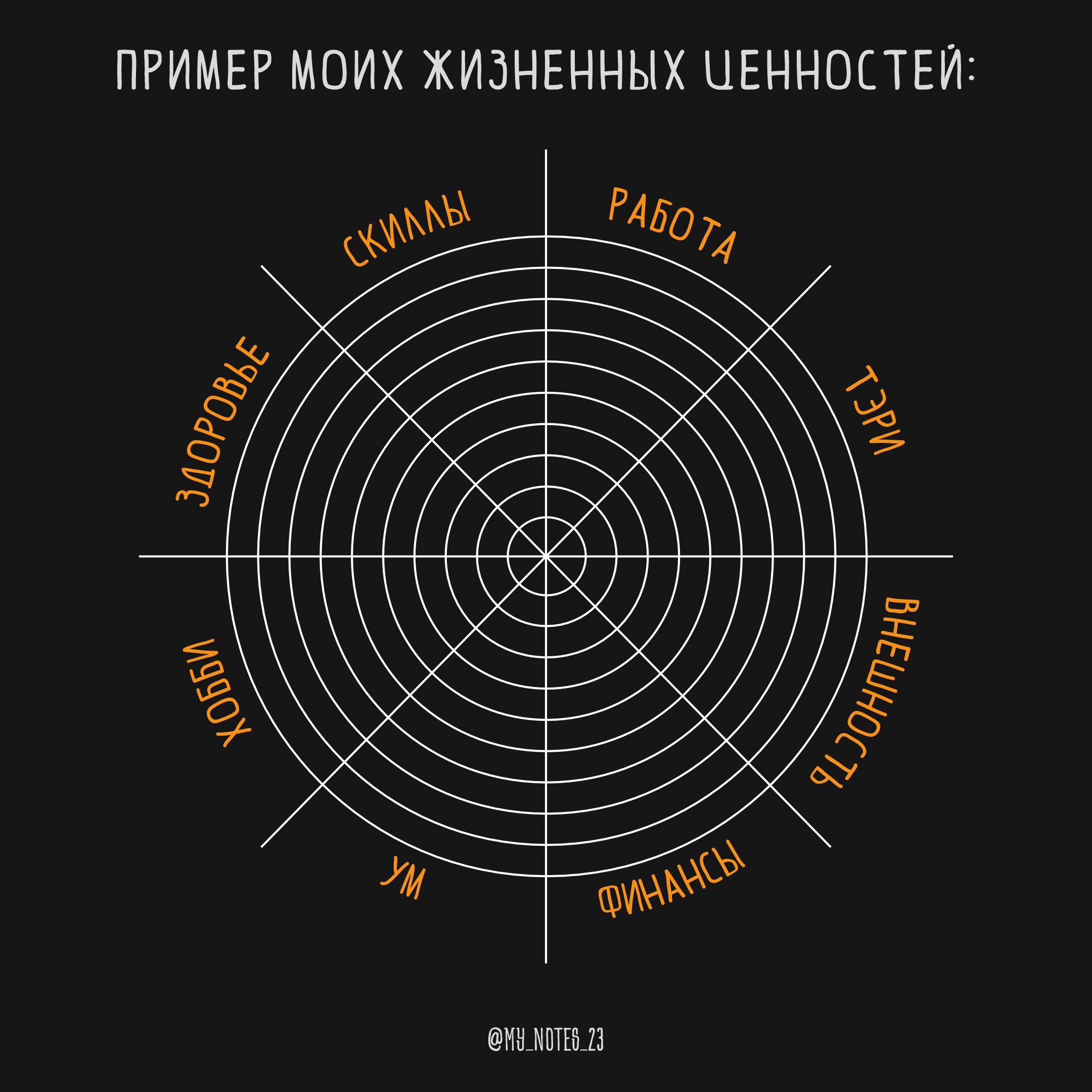 - Если не знаешь какие ценности выбрать, используй универсальные. здоровье, работа, окружение, семья, личная жизнь, финансовое благополучие, софт-скиллы и хобби.