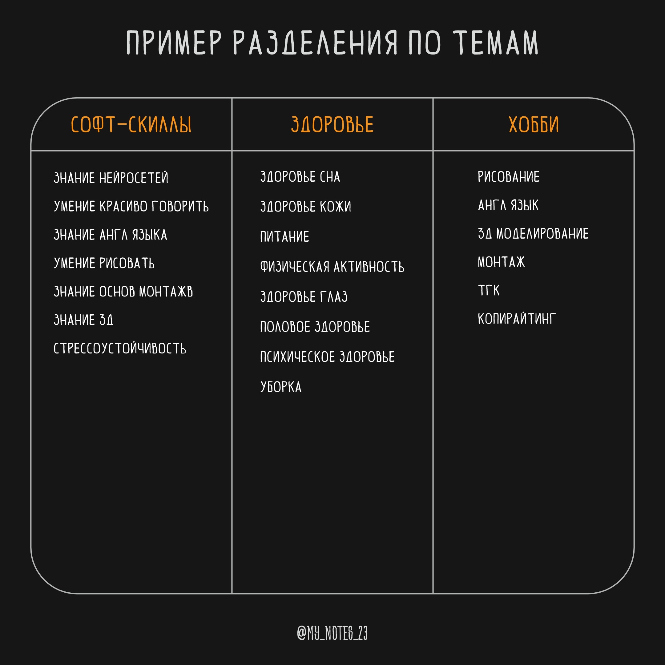 ✔️ 3. Разбей жизненную ценность на конкретные темы и категории. Это поможет четко определить, над чем нужно работать и как именно это будет способствовать твоему развитию.