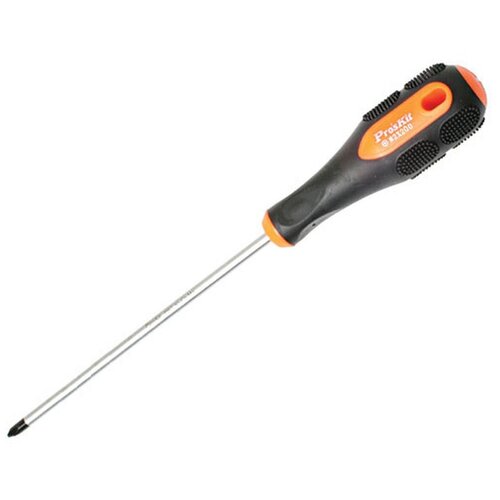 Tournevis Pro'sKit 9SD-214B (PH2x200mm). Poignée caoutchoutée antidérapante, la forme améliorée de la poignée permet une plus grande force. Pointe magnétique recouverte d'un film d'oxyde noir pour protéger contre la corrosion. Acier au chrome-molybdène vanadium AISI 8660 Cr-Mo-V Longueur de la partie travaillante : 200 mm Diamètre de la partie travaillante : 6 mm Longueur totale de la croix. pointe en forme PH2.
