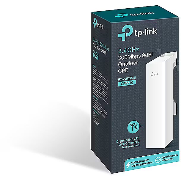 TP-LINK’s 2.4GHz 300Mbps 9dBi Outdoor CPE, the CPE210 is dedicated to cost effective solutions for outdoor wireless networking applications. With its centralized management application, it is flexible and ideal for point-to-point, point-to-multipoint and outdoor Wi-Fi coverage applications. Professional performance, coupled with user-friendly design, makes CPE210 an ideal choice for both business and home users.