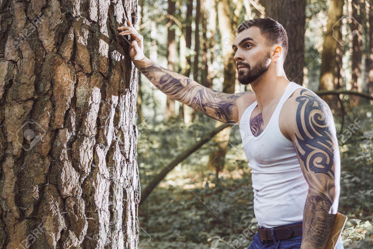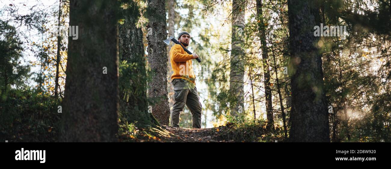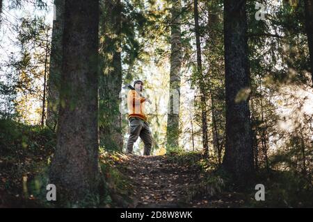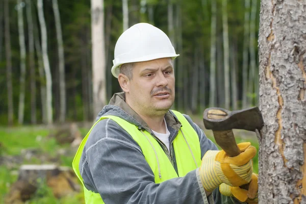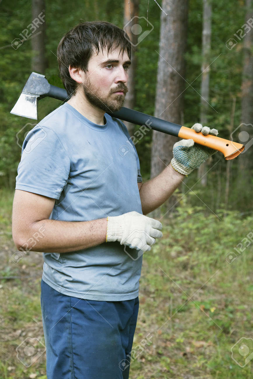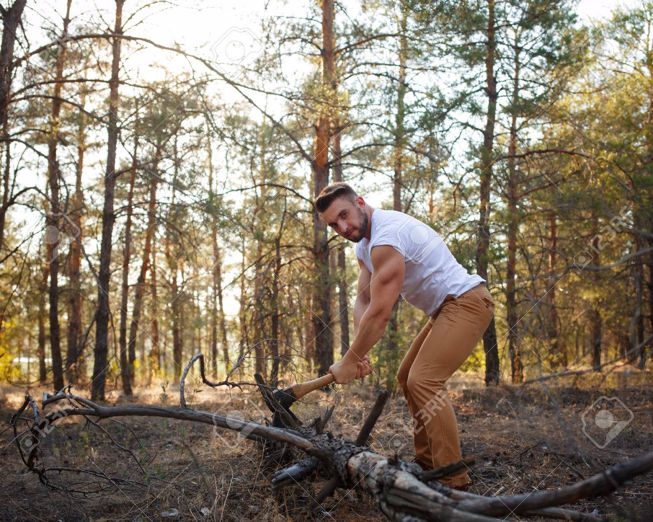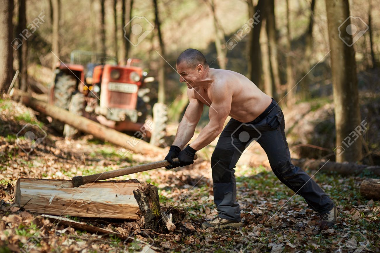 Trabajando con su hacha en el bosque