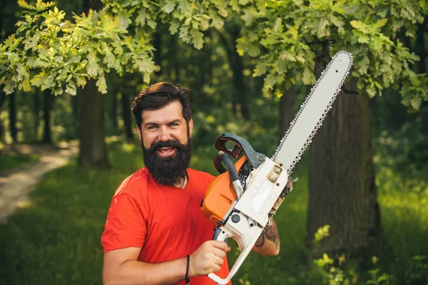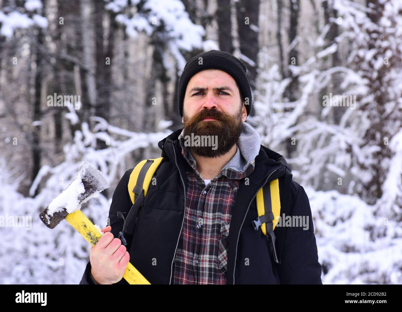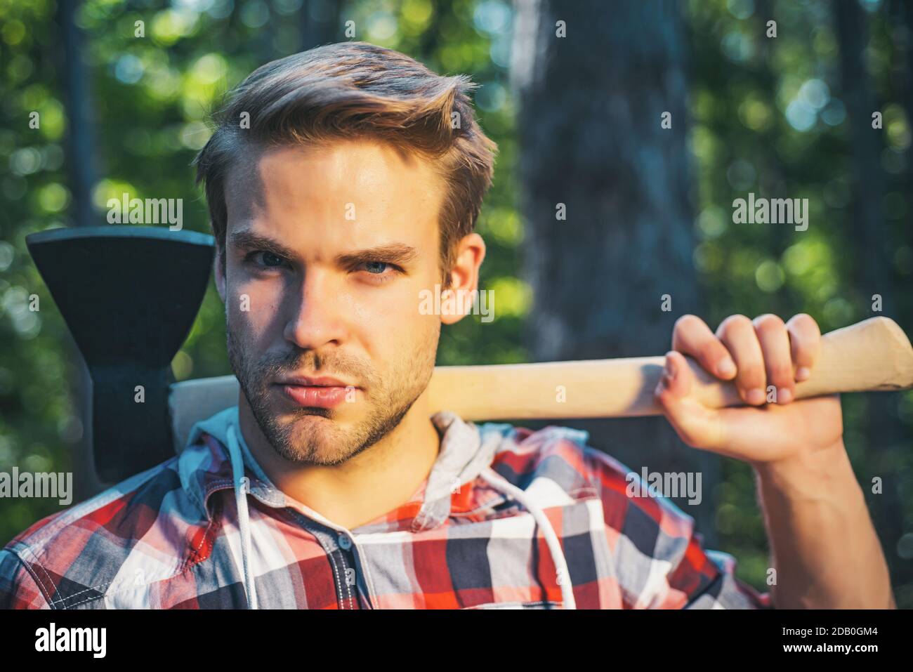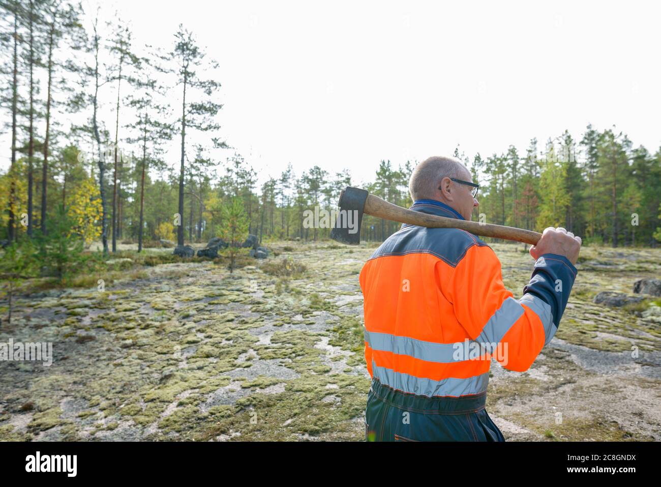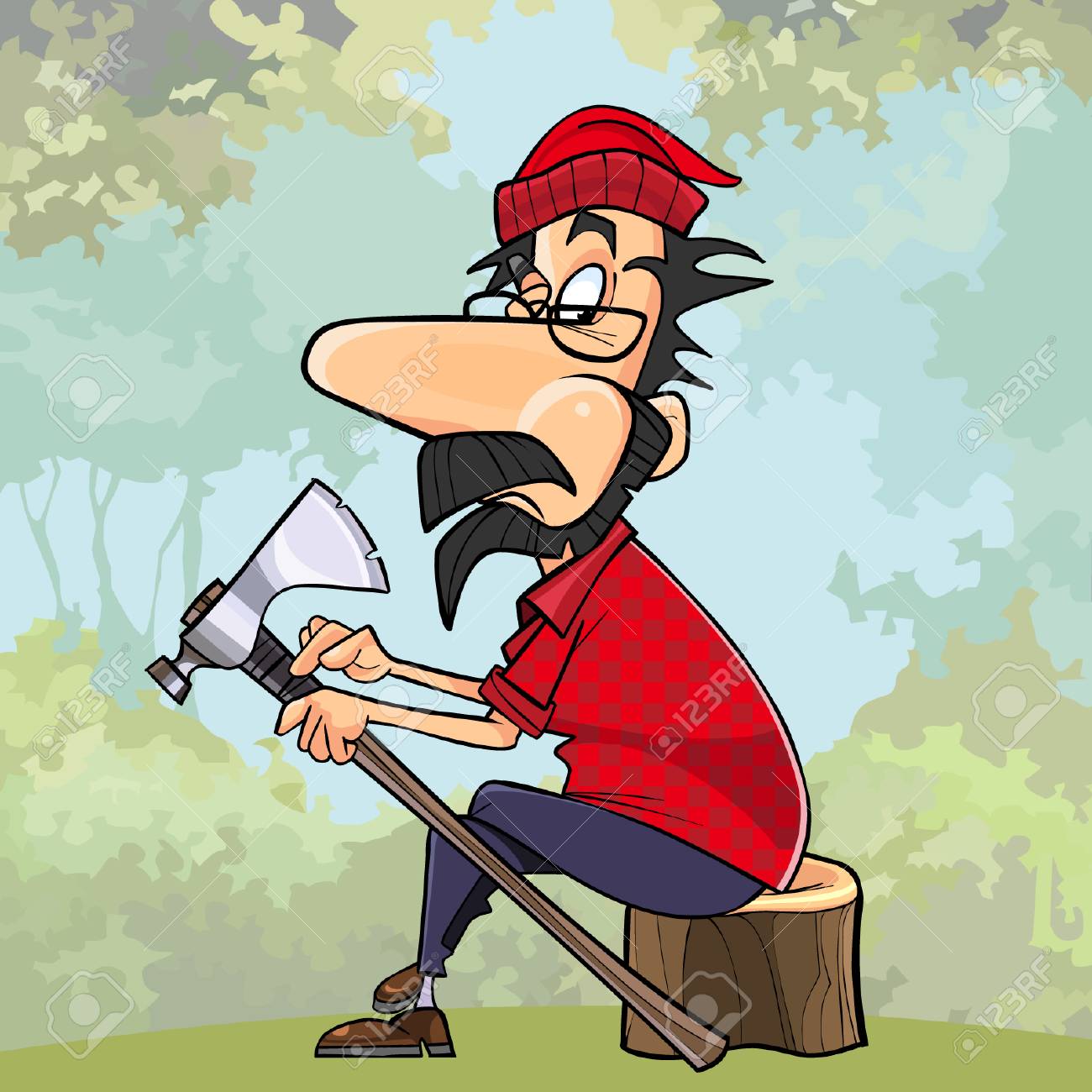 Trabajando con su hacha en el bosque