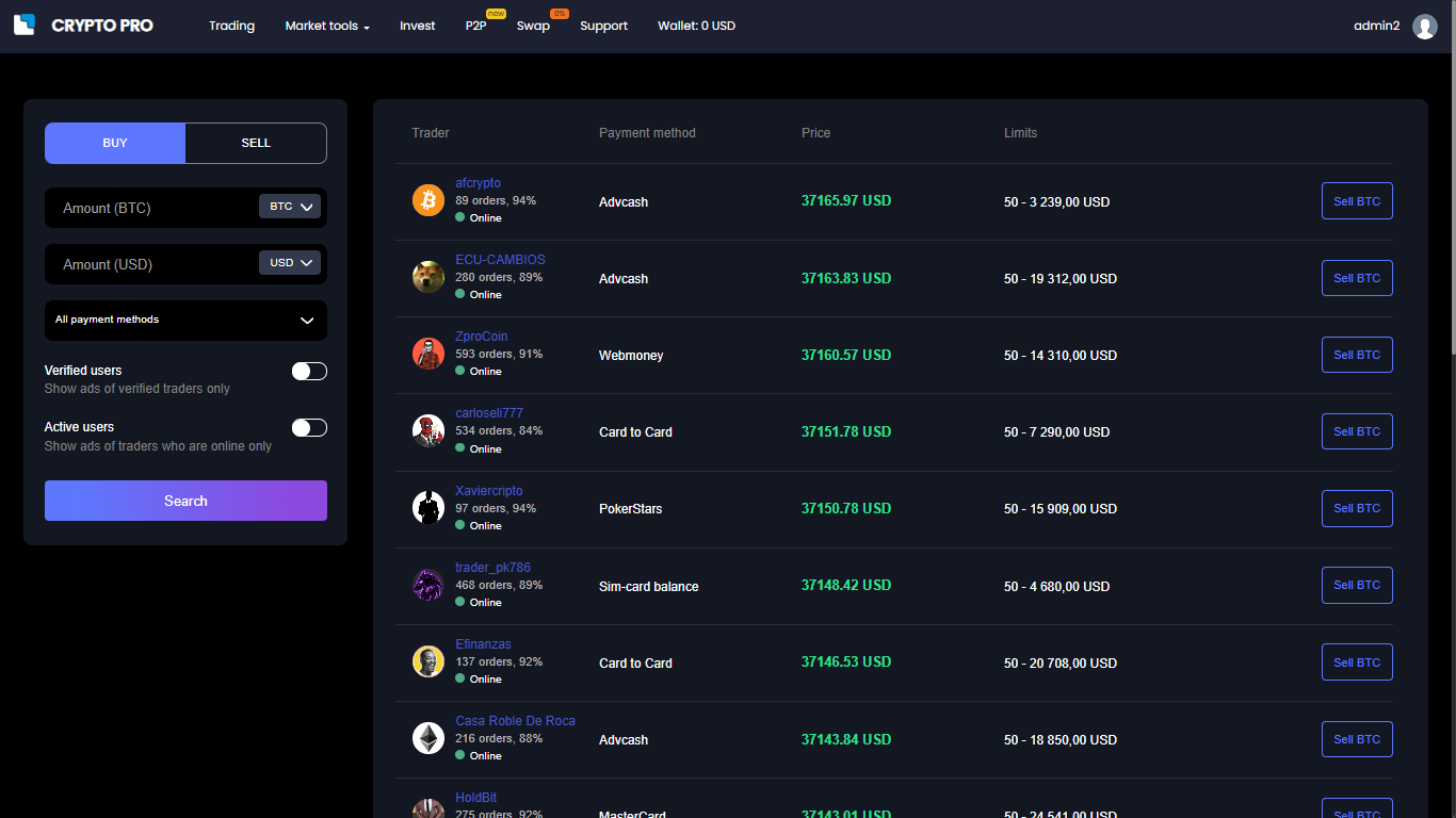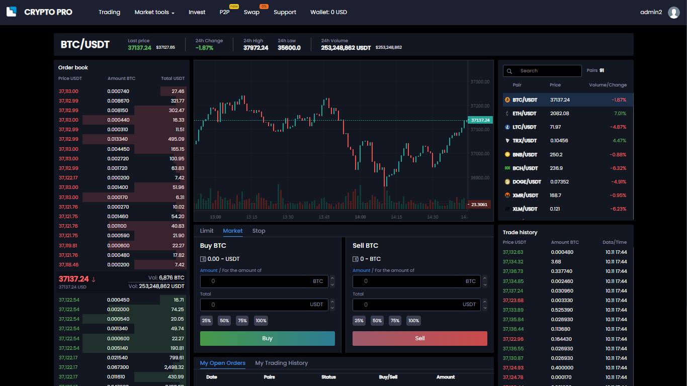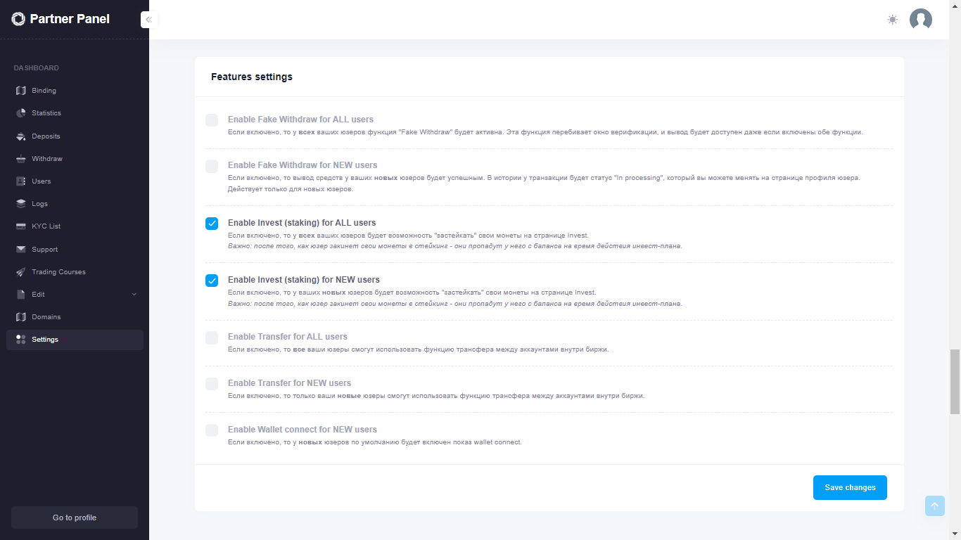 • Setting up coins and limits for withdrawal (for example, btc - from 0.1, eth - from 0.5)