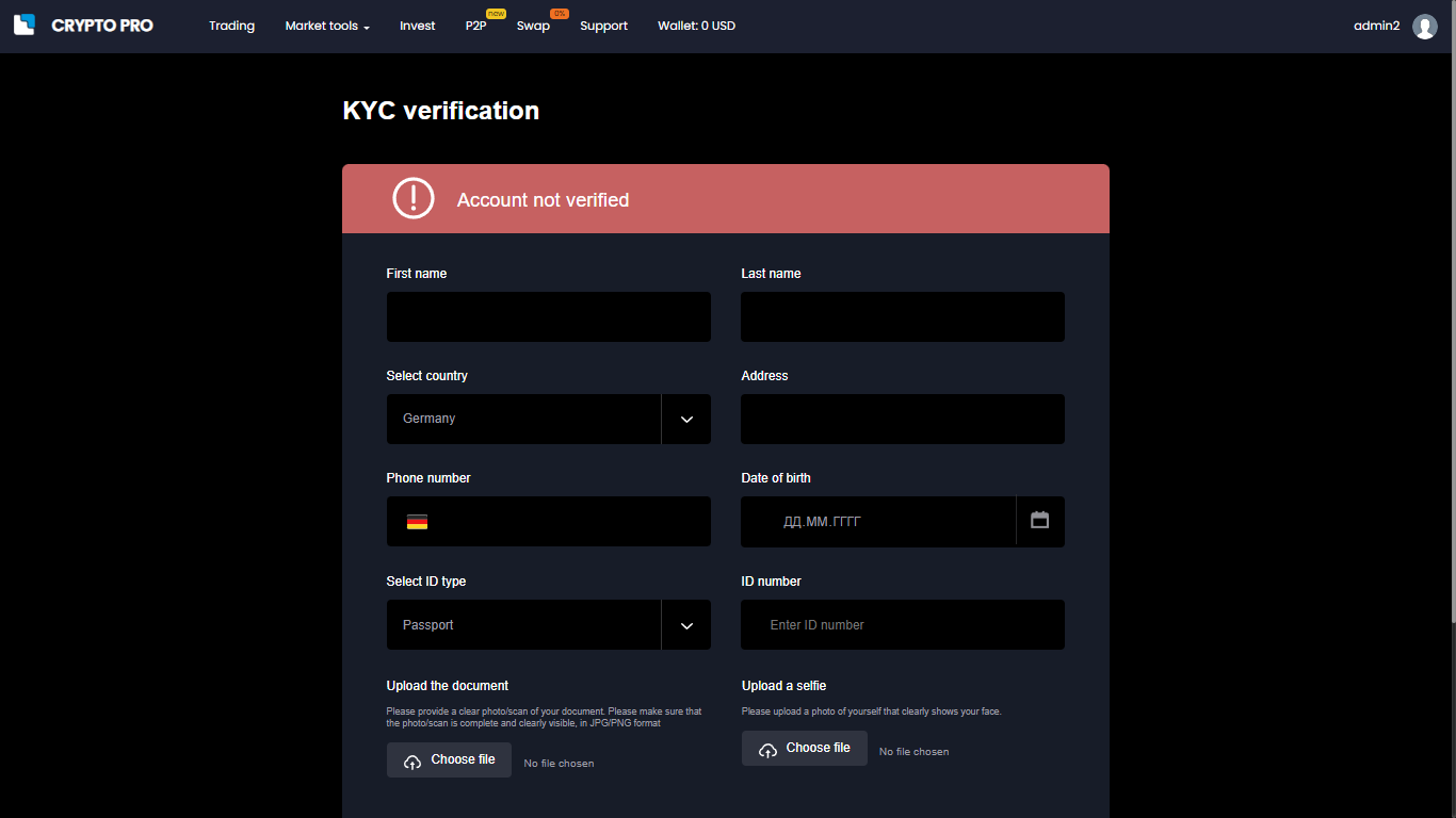 • Telegram ID, to receive notifications (about deposits, withdrawals, kyc, 2fa, message to support, mnemonics binding)