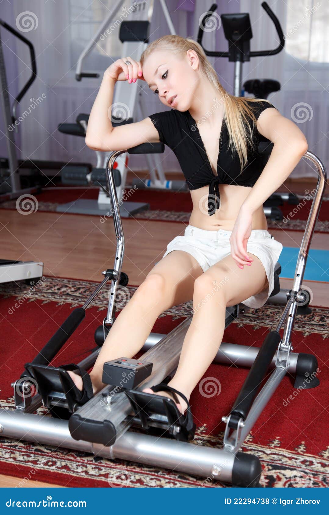 Трахает блондинку на тренажере