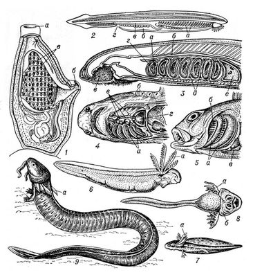 Водные личинки некоторых насекомых (подёнок, веснянок, ручейников) имеют трахейные жабры - выросты брюшка, а у личинок стрекоз - это складки задней кишки, густо пронизанные трахеями . Жабры водных низших позвоночных животных представляют собой парные симметричные . . .