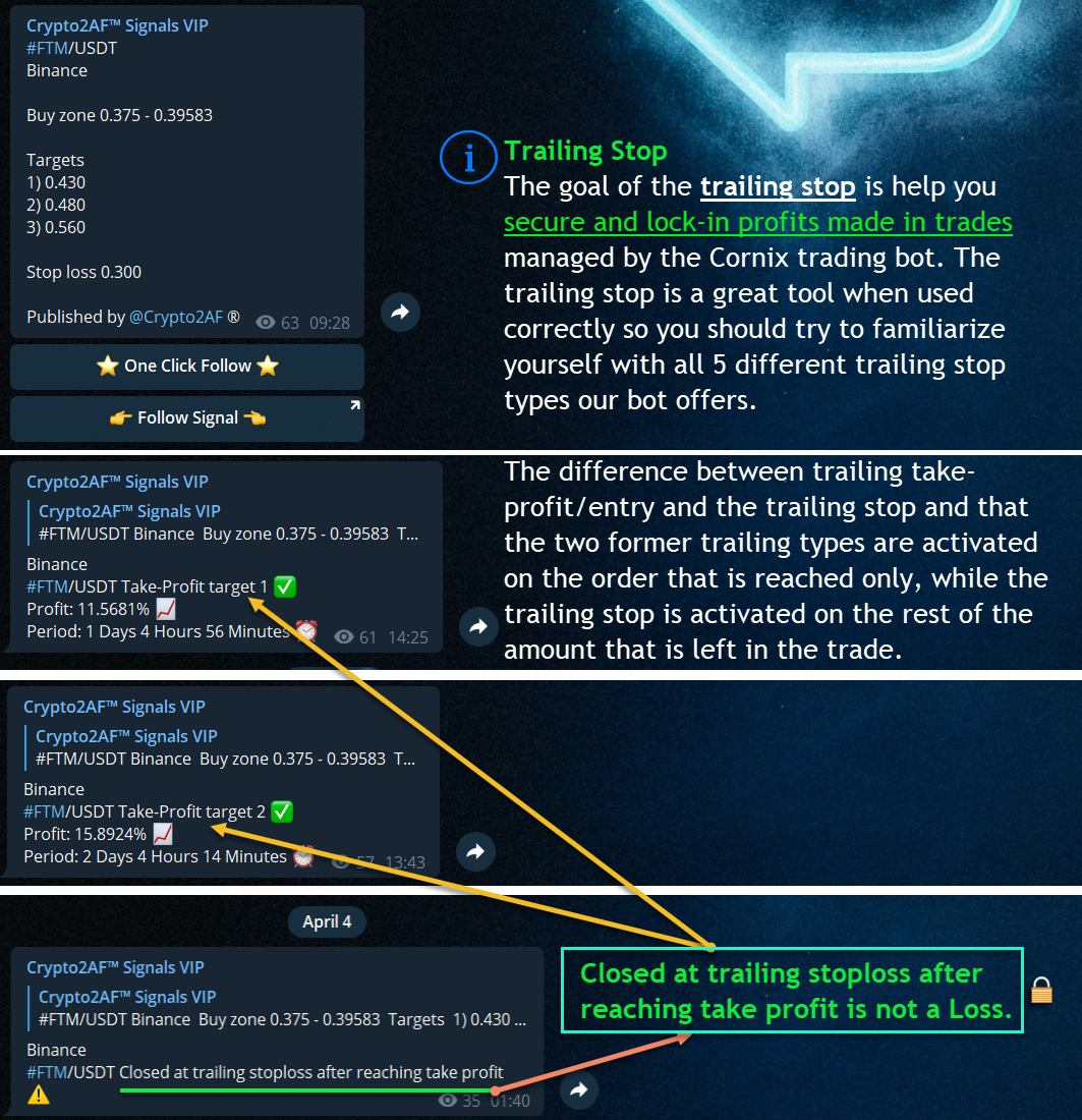 The goal of the trailing stop is help you secure and lock-in profits made in trades managed by the Cornix trading bot. The trailing stop is a great tool when used correctly so you should try to familiarize yourself with all 5 different trailing stop types Cornix Trading bot offers.