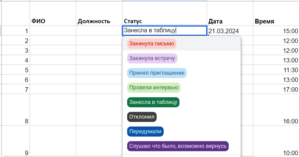 - Для каждого респондента можно указывать статус по взаимодействию (успешно провели интервью, не пришел на встречу, отказался от участия и т.д.) — это помогает отследить, добавили в таблицу интервью с этим пользователем или нет, а также позволяет собрать статистику отказов/срывов интервью. Еще можно добавить базовую информацию (дата встречи, время, ссылка, комментарии и прочее).