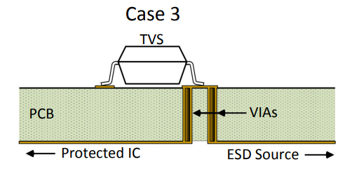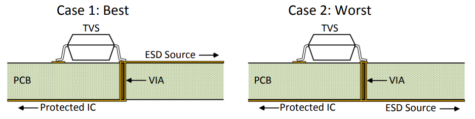 Главная идея в том, чтобы путь между ESD источником и ESD защитой был прямым, без переходных отверстий. А уже после того, как сигнал дошел до защиты, можно использовать VIA.