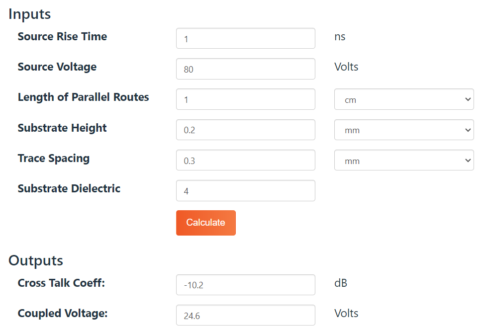 Для примерной оценки воспользуемся таким калькулятором cross-talk и посчитаем сколько будет напряжение при выбросе 80V, между двумя дорожками длиной 1см и расстоянием 0.3мм: