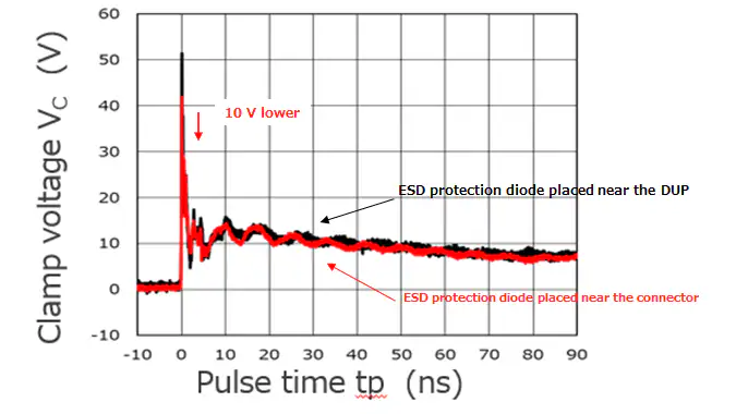 Чтобы обеспечить надежную ESD защиту, не достаточно просто выбрать правильный диод. Нужно еще как-то расположить его на плате и выполнить трассировку. В идеале, его следует расположить как можно ближе к разъему, но очень часто это бывает затруднительно. Не хватает места, мешают соседние дорожки и т.п.
