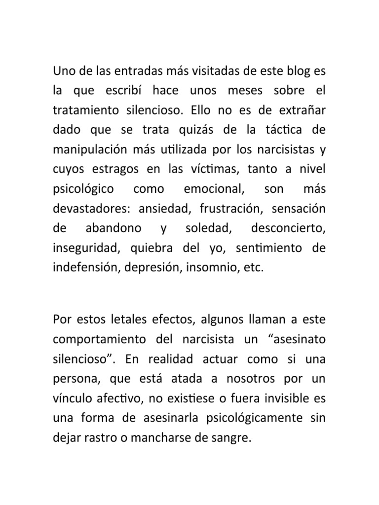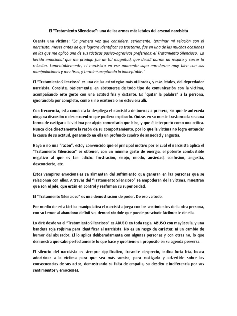 El tratamiento silencioso El tratamiento silencioso es una técnica de manipulación que utilizan los psicópatas narcisistas a modo de castigo . Consiste en abstenerse de toda comunicación contigo y va unida a una actitud fría y distante . Te ignoran y pasan de ti como si no existieras .
