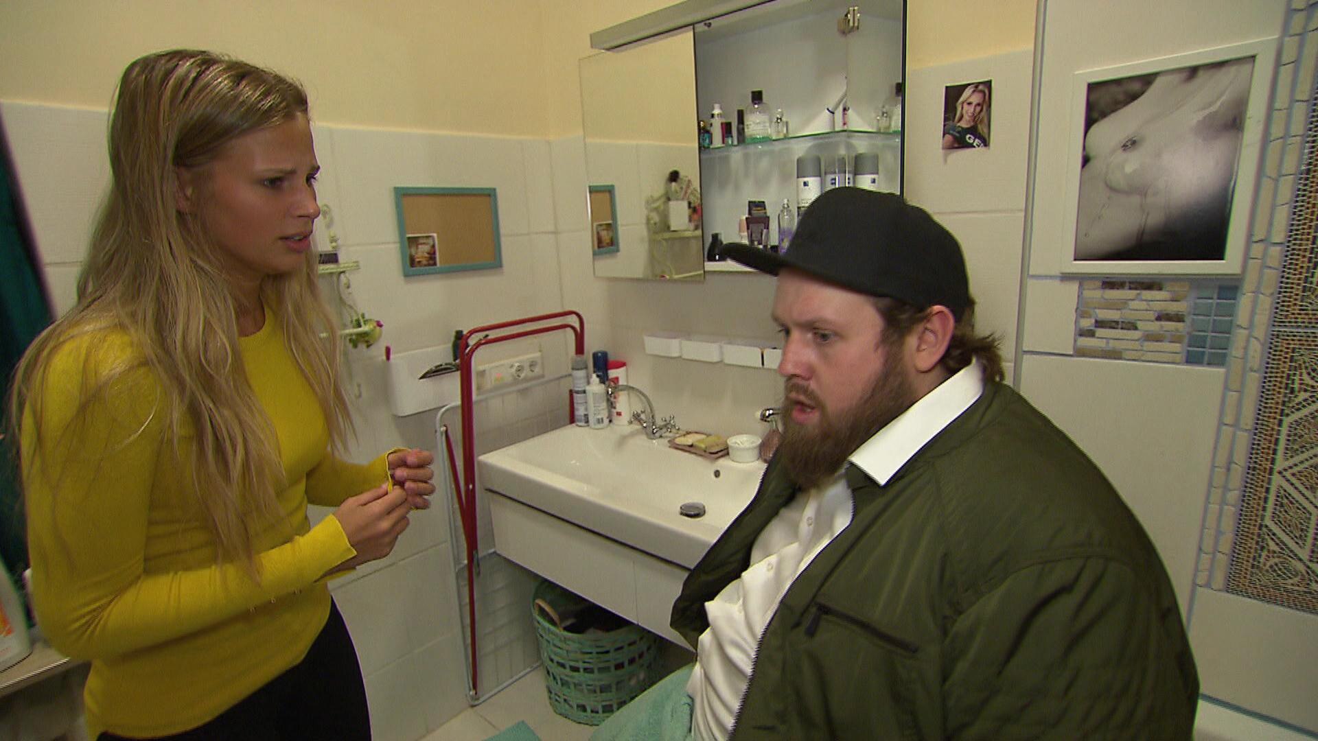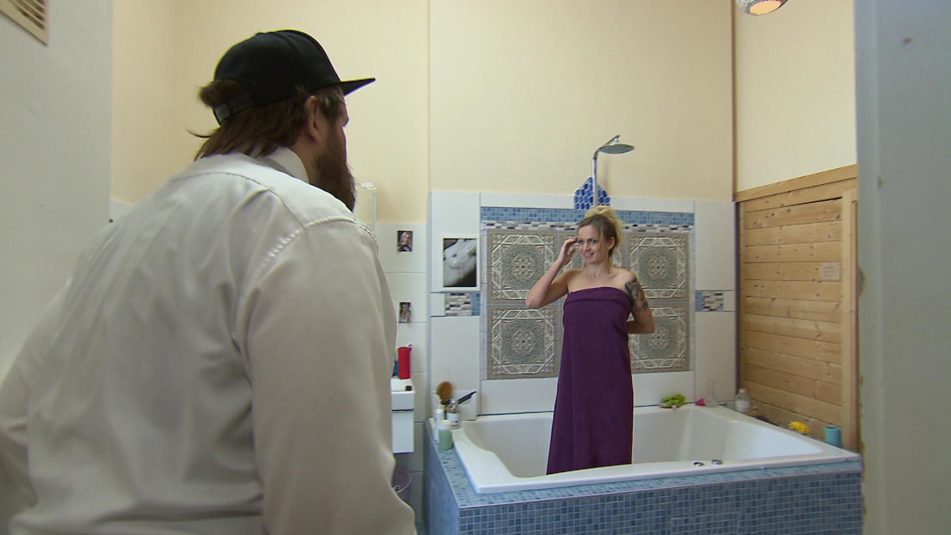 Im Bad vernascht er das dunkelhaaarige Tittengirl