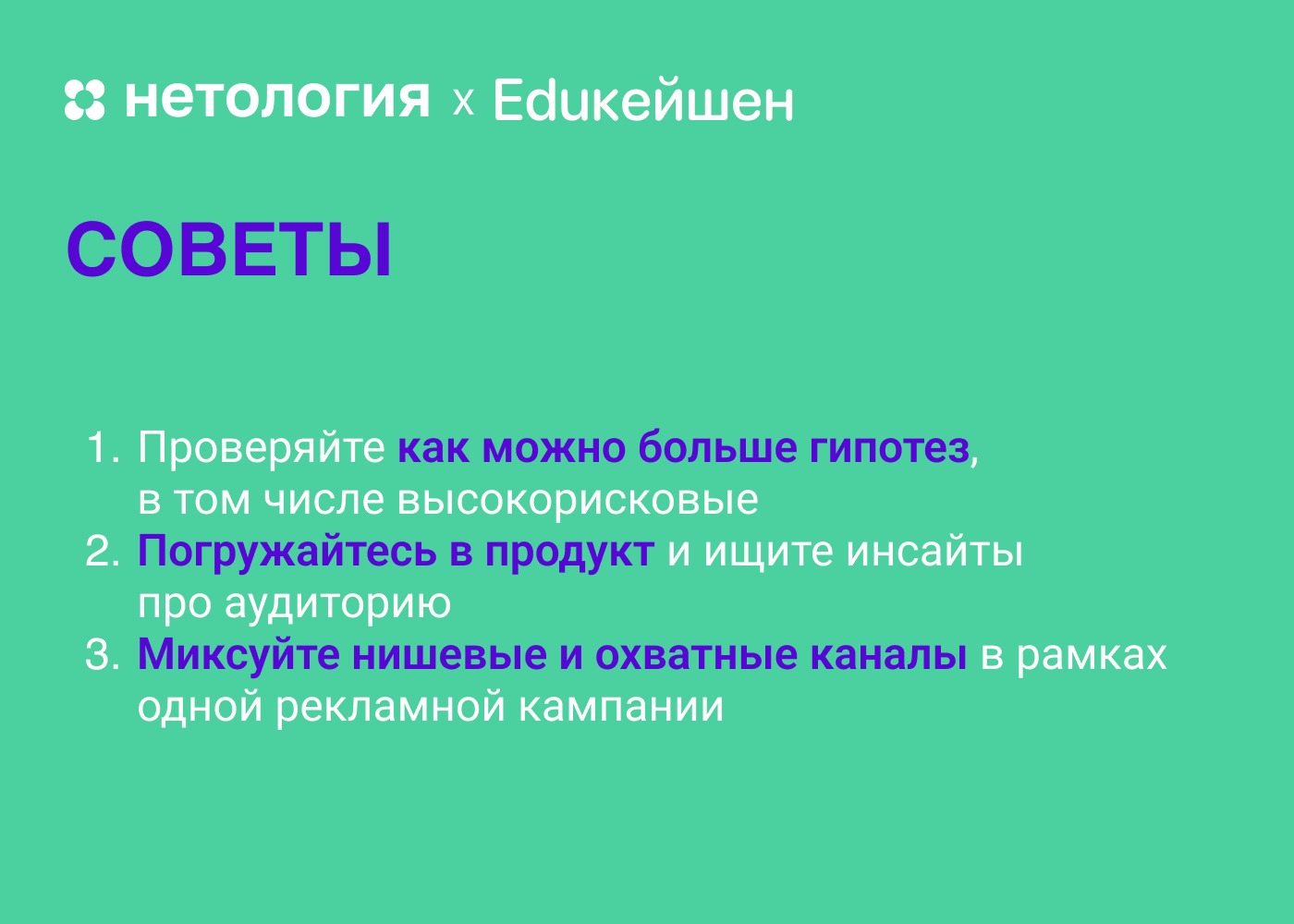 - Проводить как можно больше тестов – с посылами, креативами, каналами и площадками. Не бояться высокорискованных гипотез.