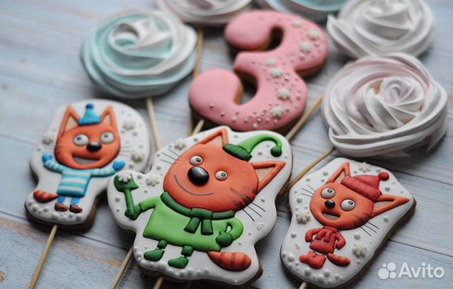 На детский праздник и на любой торт на палочках пряники с изображениями любимых персонажей - здесь Компот, Карамелька, Коржик, мама, папа и Лапочка из мультфильма "Три кота" .