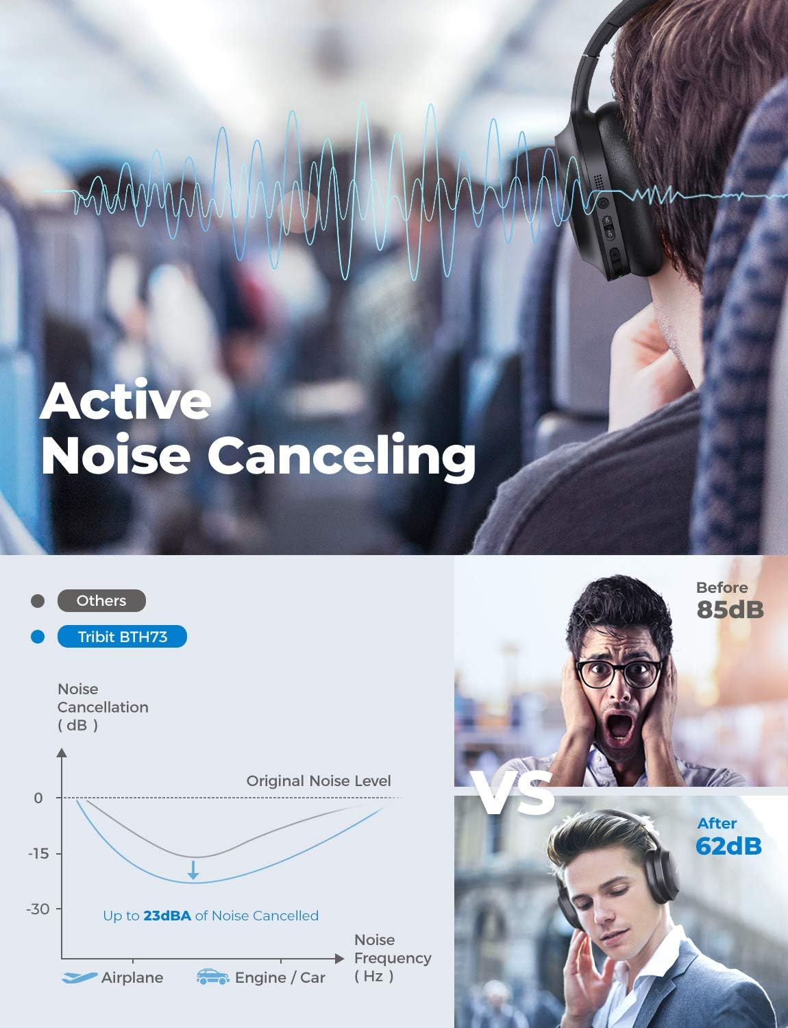 Tribit Active Noise Cancelling Wireless Headphone . Crafted from metal and ABS material featuring noise cancelling . Lightweight, foldable, and easy to carry around . The battery life lasts up to 25 hours . The 1-for 2 (simultaneously connect 2 devices) 5 .0 Bluetooth headphone boosts built-in high-sensitivity call MIC and low-power Qualcomm . . .