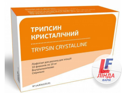 Трипсин кристаллический - ферментный препарат протеолитического действия, получаемый из поджелудочной железы крупного рогатого скота . Трипсин обладает выраженными противовоспалительными и противоотечными свойствами, способен расщеплять омертвевшие участки тканей, фибринозные образования, вязкие секреты и экссудаты .