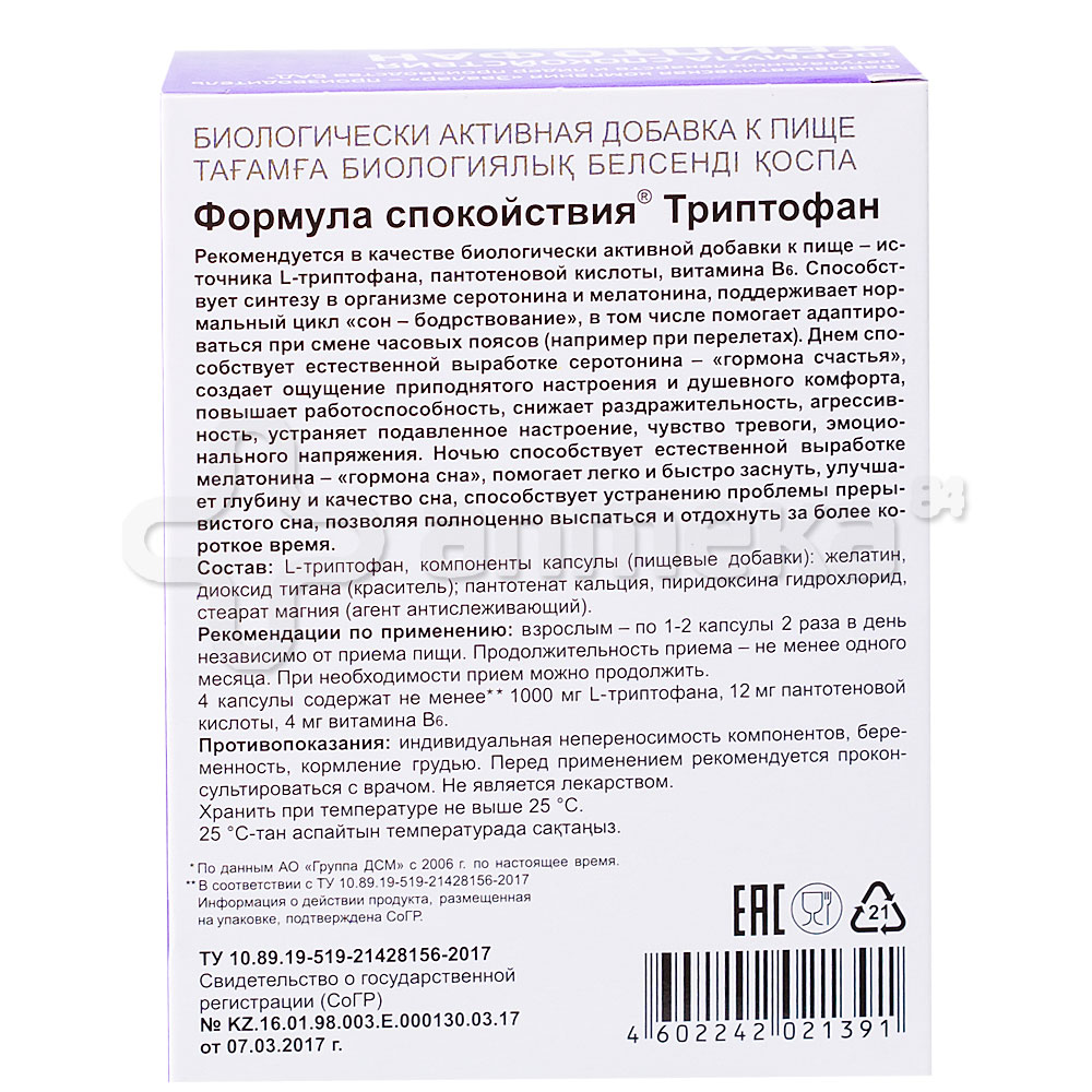 Формула спокойствия® Триптофан: инструкция по применению, характеристика, способ . . .