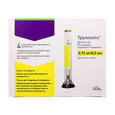 Форма выпуска, упаковка и состав препарата Трулисити ® Раствор для п/к введения прозрачный, бесцветный . Вспомогательные вещества: лимонная кислота безводная - 0 .07 мг, маннитол - 23 .2 мг, полисорбат 80 (растительный) - 0 .10 мг, натрия цитрата дигидрат - 1 .37 мг, вода д/и - q .s . до 0 .5 мл . 0 .5 мл - шприцы (1) - шприц-ручки ( 4 ) - пачки картонные .