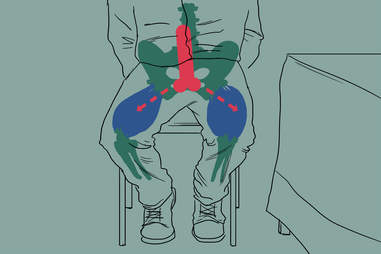 penis goes down between your legs and in your ass crack . As you start this, you won't have much penis behind you, then as you stretch this, more and more you will have a longer penis behind you . When you switch legs, you start over . Also, always good to slap your penis out and get circulation back into your schlong .