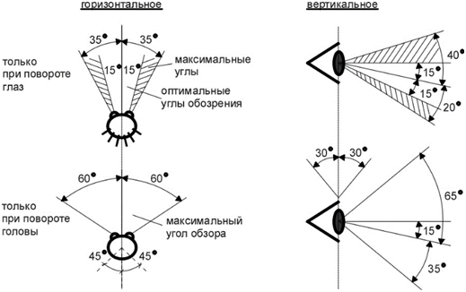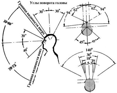 Средняя величина поля зрения составляет: вверх от точки фиксации взора – 55 градусов, вниз – 60 градусов, т.е., 115 градусов, в височном направлении – 90 градусов, в направлении к носу – 60 градусов, т.е. 150 градусов на каждый глаз