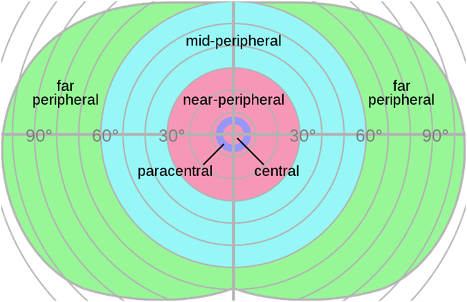 Степень потери периферического зрения обусловлена уровнем физической и психологической тренированности и предыдущим опытом. Но в любом случае потеря зрения будет от 10% до 80% горизонтального обзора и от 10% до 50% вертикального обзора. Об этом и о многом другом говорится в «Справочнике по физиологической оптике», написанном Германом фон Гельмгольцем в 1851 году.