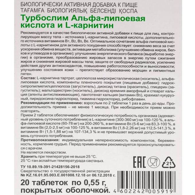 Турбослим Альфа-липоевая Кислота И L-карнитин . . .