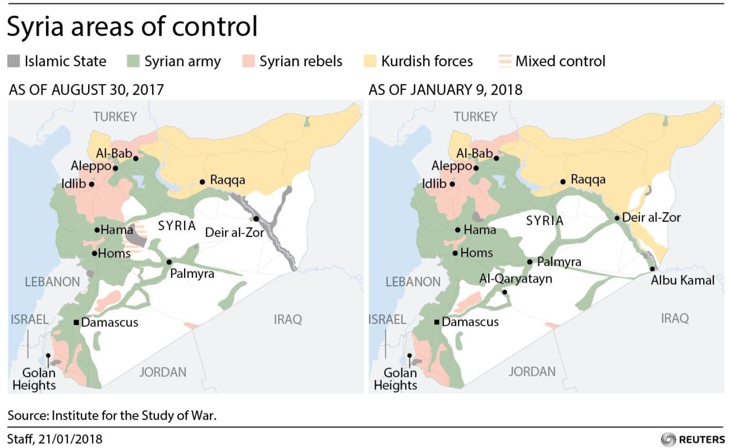 Город Африн и его окрестности в Сирии, на которые сейчас напала Турция, находятся под контролем Отряда народной самообороны сирийских курдов. Турция считает, что «Отряд» связан с РПК, сирийские курды эту связь опровергают. К атаке на стороне Турции присоединилось около 25 тысяч бойцов Свободной Сирийской Армии - группировки, поддерживаемой Турцией. Если план Эрдогана удастся воплотить в жизнь, и курды покинут район Африна, стратегически важная часть сирийской территории перейдет под контроль сирийских повстанцев из Свободной Сирийской Армии, а значит - под косвенный контроль Турции.