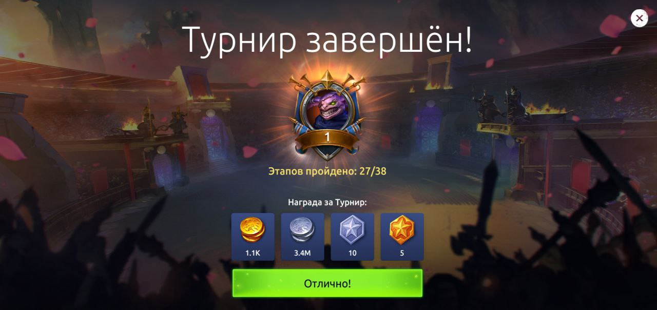 Что хотелось бы сказать в конце, Турнир - очень интересный режим, в котором соперники меняются как от вашего личного роста, так и от выпущенных новых героев. Поэтому, если вы хотите добиваться высоких мест, вам следует активно и равномерно прокачивать метовых героев и изучать сильные и слабые стороны ваших противников. Тогда следующая картинка будет вас преследовать каждую неделю.