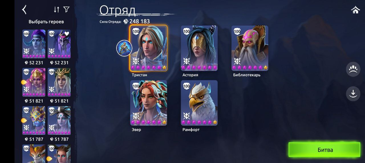 Данный отряд будет полезен на Турнирах при среднем уровне развития аккаунта благодаря широкой возможности использовать бонусных героев против неметовых пачек. Начальная комбинация: 2 способность Астории+3 способность Тристана+3 способность Библиотекаря, практически всегда либо убивает отряд соперника полностью, либо оставляет 1-2 соперников с минимумом здоровья. Таким образом, вместо Эвер и Рамфорта можно ставить двух бонусных героев, использовать которых иначе не получается.