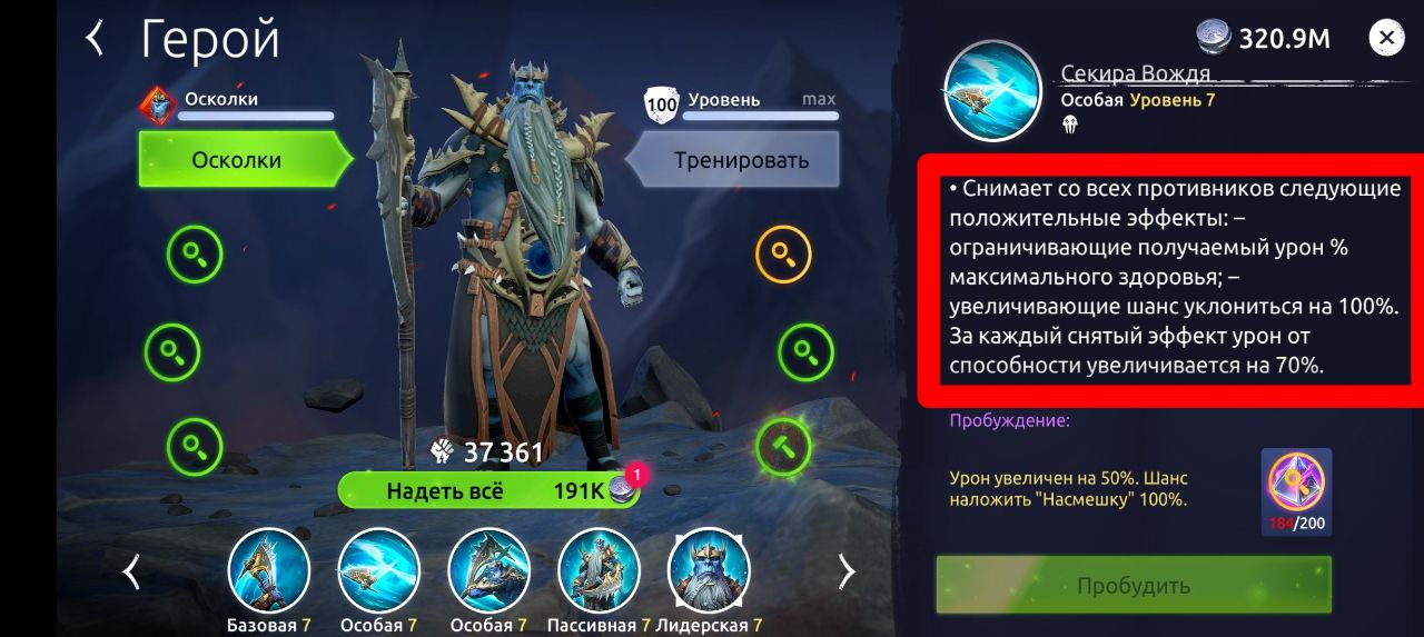 Массовая атака Тан'Арга наносит сокрушительный урон по отрядам, имеющим на себе эффекты снижения урона в % или шанс увернуться от атак 100%. Способность снимает эти эффекты и за каждый снятый повышает свой урон на 70%.